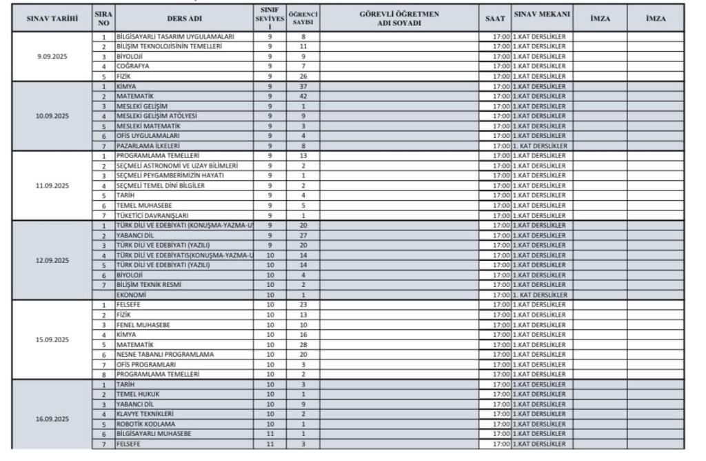 EYLÜL DÖNEMİ SORUMLULUK SINAVI PROGRAMI